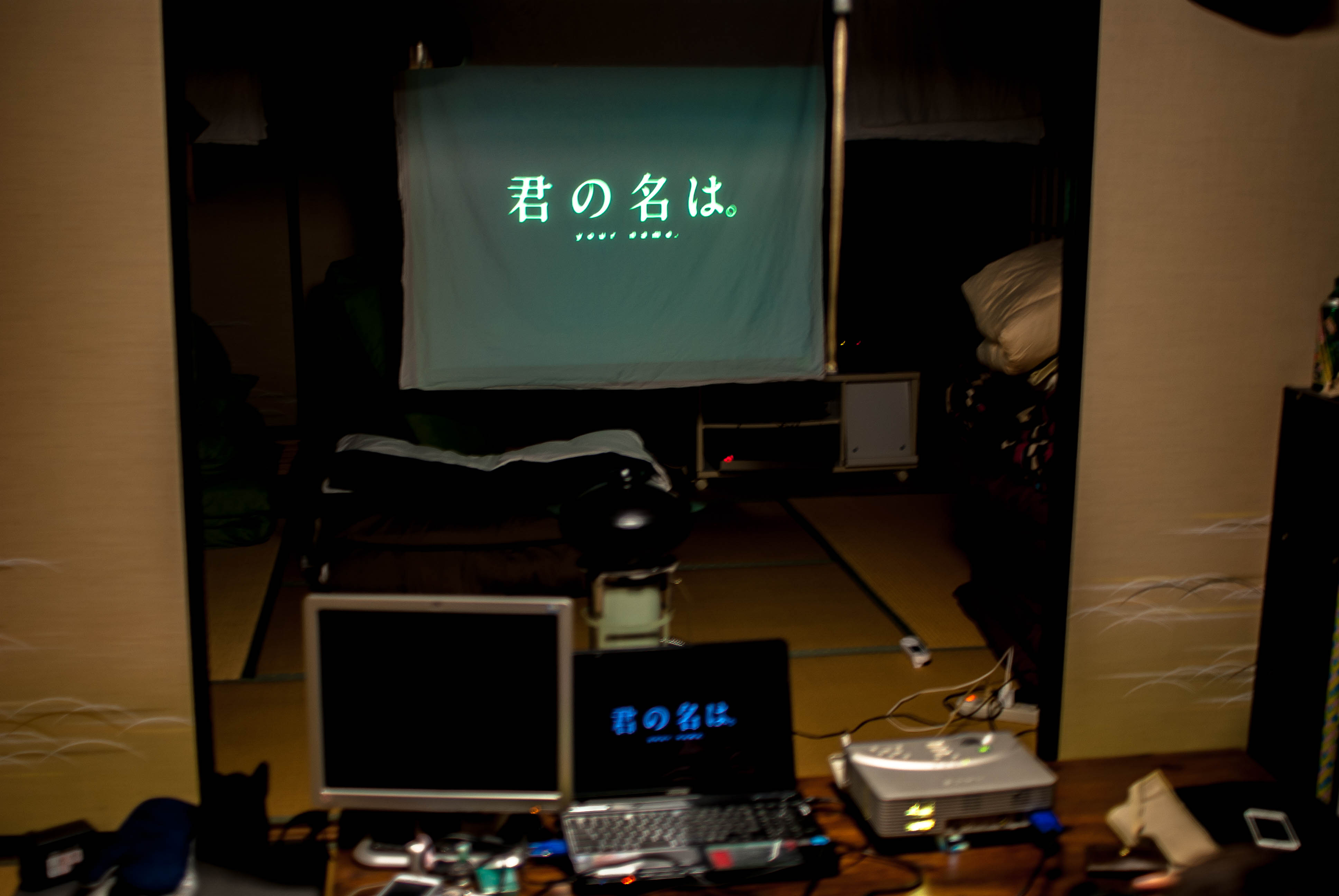 シーツをスクリーンに、プロジェクターで映画を愉しむ一時。